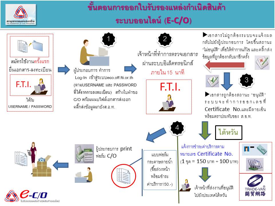 สภาอุตสาหกรรมแห่งประเทศไทย ได้จัดให้บริการ C/O ภายใต้ สโลแกนที่ว่า C/O F.T.I. สะดวก รวดเร็ว ทันใจ ภายใน 15 นาที สภาอุตสาหกรรมฯ ได้รับการรับรองอย่างเป็นทางการว่า สามารถออกใบรับรองแหล่งกำเนิดสินค้า หรือ Certificate of Origin (C/O) ตามพระราชบัญญัติ สภาอุตสาหกรรมแห่งประเทศไทย พ.ศ. 2530